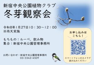新宿中央公園サポーター・植物クラブ主催による植物の冬芽観察会を行います。 新宿区HPはこちら 日時:令和7年1月27日 火曜日 午前10時30分~12時※雨天実施 お申込み:1月25日17時まで こちらからお申し込みくだ […]