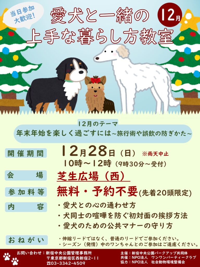 新宿中央公園では月に一度、「愛犬と一緒の上手な暮らし方教室」を開催しております。